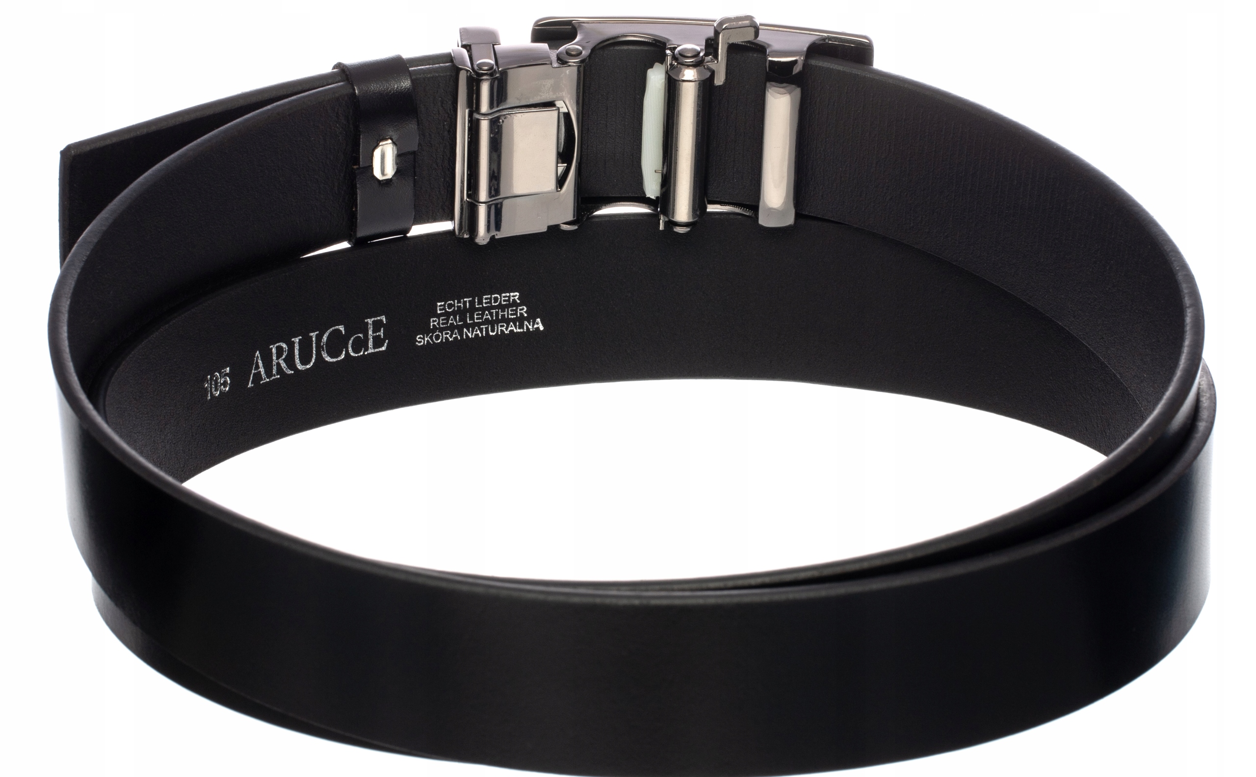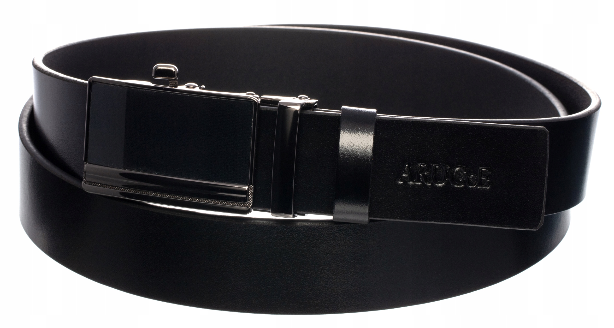 Na końcu paska znajduje się wytłoczone logo marki ARUCcE, co nadaje mu eleganckiego charakteru.